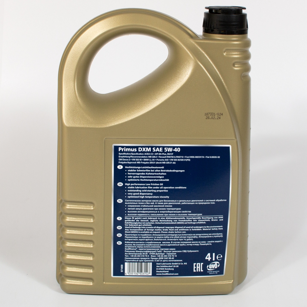 SwdRheinol Primus DXM 5W-40 - высокопроизводительное моторное масло с низким уровнем сульфатной зольности, фосфора и серы, благодаря новой технологии присадок «Low SAP». Для двигателей с системой обработки выхлопных газов (катализатор, сажевый фильтр DPF) и без неё.