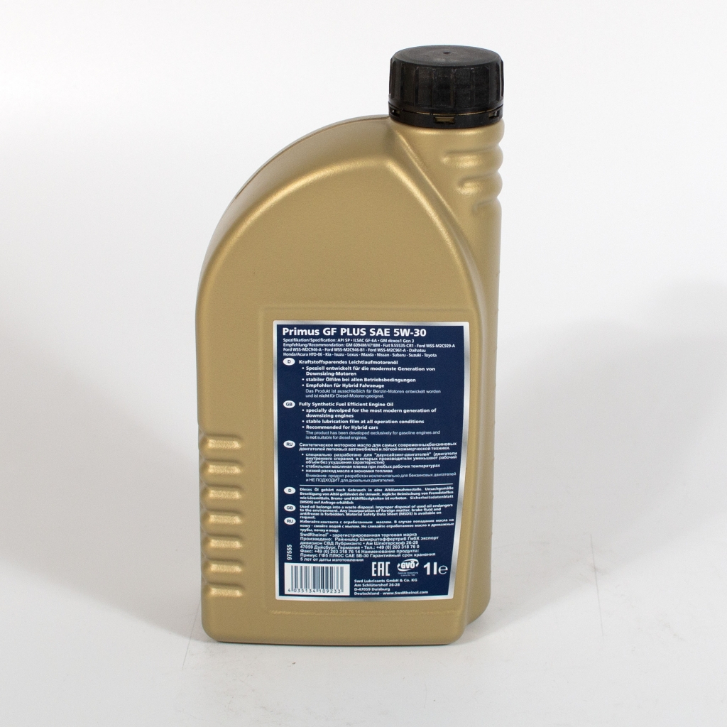 Swd Rheinol Primus GF Plus 5W-30 - синтетическое, на основе гидрокрекинга (HC), моторное масло для самых современных бензиновых двигателей легковых автомобилей и лёгкой коммерческой техники. Специально разработано для "даунсайзинг-двигателей" (двигатели внутреннего сгорания, в которых производители уменьшают рабочий объем без ухудшения характеристик). Специальная комбинация базовых масел и присадок предотвращает преждевременное воспламенение смеси в цилиндре (LSPI - Low Speed Pre Ignition).