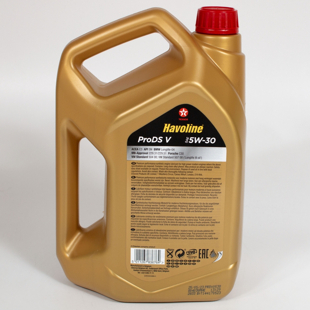 Havoline ProDS V SAE 5W-30 — это синтетическое моторное масло премиум-класса с низким содержанием сульфатной золы, фосфора и серы (SAPS), в состав которого включены современные присадки в соответствии с требованиями ведущих производителей оригинального оборудования, включая требования к смазочным материалам двигателей Volkswagen-Audi 504.00/507.00.