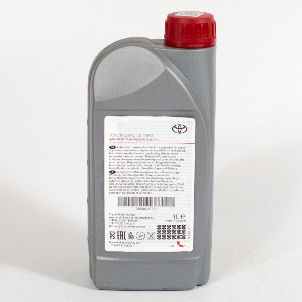 TOYOTA ATF D III - полностью синтетическое трансмиссионное масло для автоматических коробок передач автомобилей концерна Toyota. TOYOTA ATF Dexron III для автоматических трансмиссий полностью соответствует требованиям, предъявляемым к жидкостям ATF данного класса. Оптимальные вязкостные характеристики, износостойкость, хорошая текучесть при низких температурах, стойкость к окислению обуславливают применение этой жидкости в автомобилях Toyota.